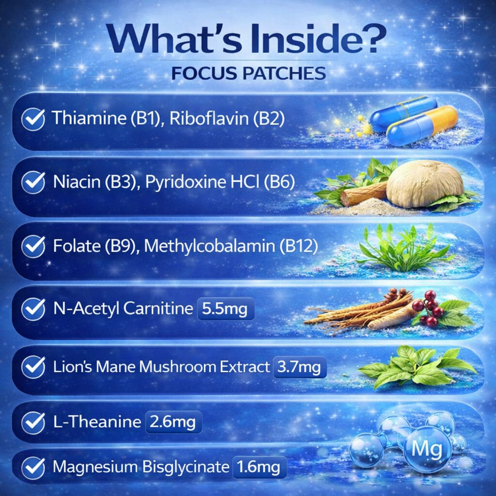 Answer 1: The patches use transdermal technology to deliver a blend of Vitamin B Complex and nootropic nutrients steadily through your skin. This allows for slow, consistent absorption over several hours, providing sustained support for mental clarity and productivity.