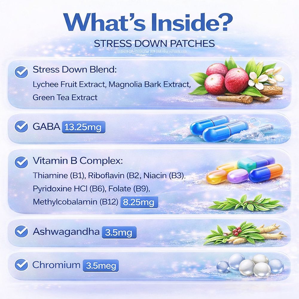 Answer 1: The patches use a steady-release delivery system to gradually absorb a blend of botanical extracts, GABA, Ashwagandha, and B vitamins through the skin. These ingredients work together to support emotional balance and help manage everyday stress.